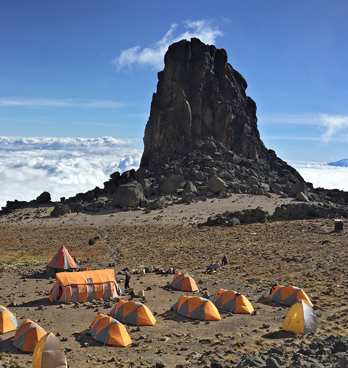 Your hike today takes you towards to Kibo cone steadily climbing up and over the edges of the alpine desert to your first high altitude at the lava tower (4630m or 15190ft). Today helps you to acclimatize and also is a great indicator to see how your body can handle the higher altitude. From the Lava Tower you begin your steep descent anti clockwise around Kibo and into the Barranco Valley passing the large flowering mountain cacti (Kilimanjaro Senecios) unique to Kilimanjaro. The day ends around the same elevation as you started on the edge of the heather and moorland.